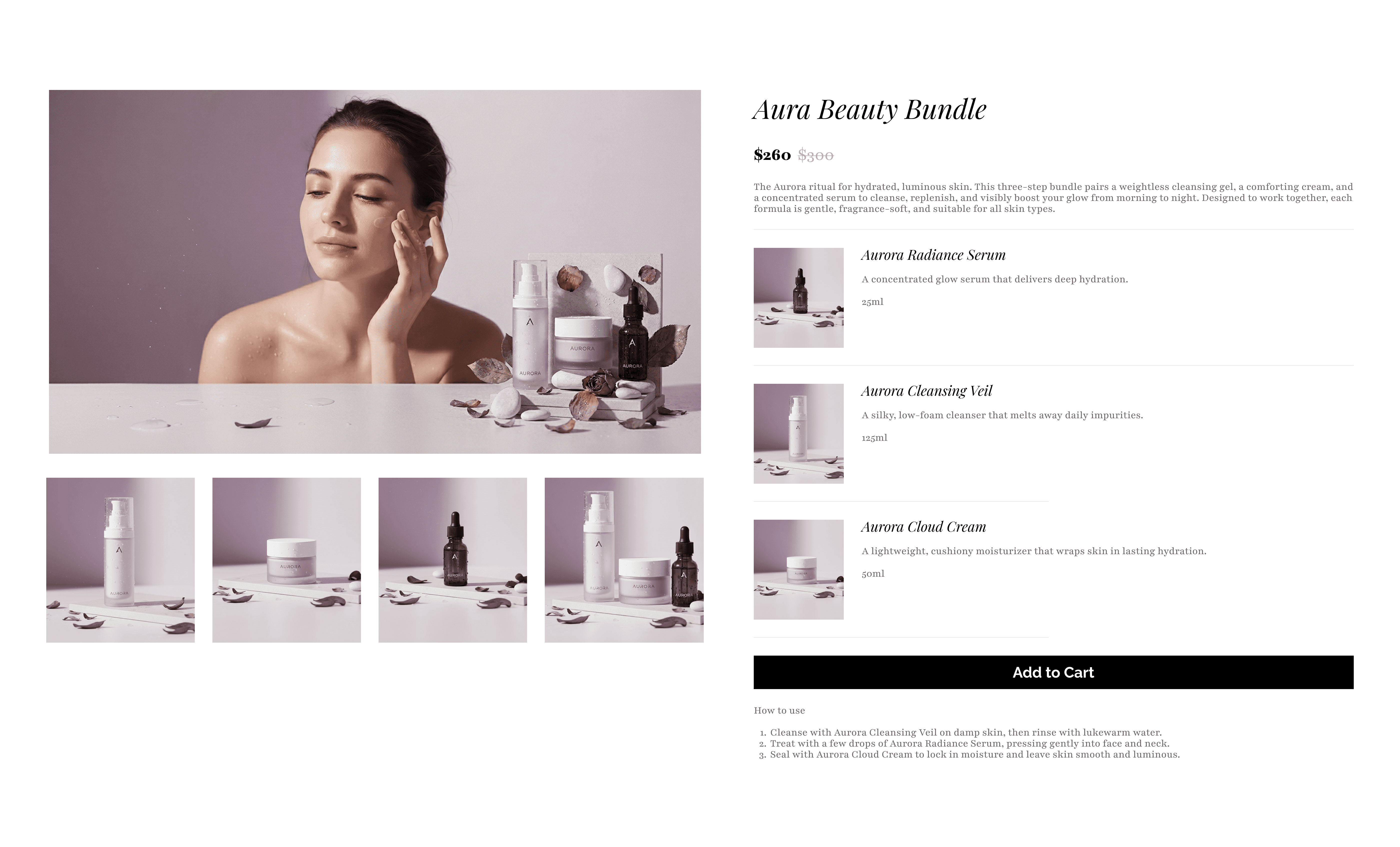 Curated sets. You decide what goes in the bundle and the customer adds the whole thing in one click. A skincare store might sell a "Morning Routine Kit" with a face wash, serum, and moisturizer. The customer doesn't have to figure out which products work together. You already did that for them.